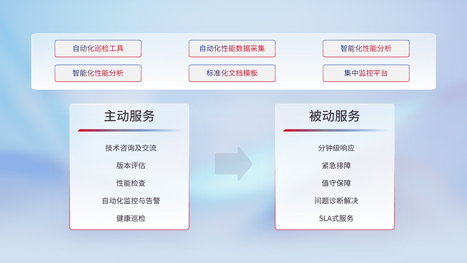 智能化工具和标准化文档,,,保障服务质量,,,提供主动服务(包含技术咨询、、、、版本评估、、、性能检查、、、、自动化监控与告警、、、、健康巡检)和被动服务包含(分钟级响应、、、、紧急排障、、值守保障、、、、问题诊断解决、、、、SLA服务)。。